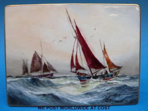 A Royal Crown Derby porcelain free standing plaque hand decorated with scenes of sailing ships under full sail and signed W.E.J Dean (11 x 14.5cm)