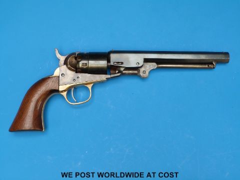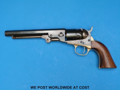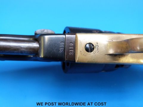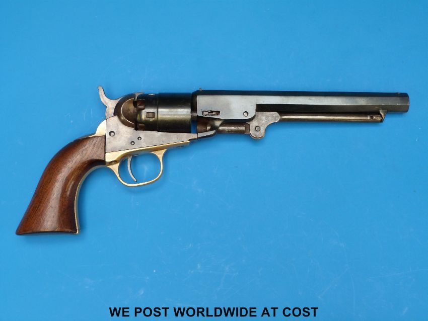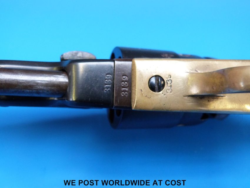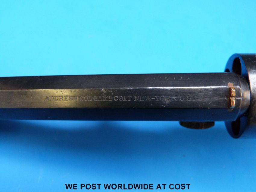 Colt Navy .36 five shot hammer action percussion pocket revolver with brass trigger, guard sights and back strap, stamped to one side 'Colts Patent', the cylinder stamped 3139 and with the remnants of an engraved scene, the 6.5 inch octagonal barrel stamped 'Address Col SamL Colt New-York U.S.A.', serial number 3139, overall length 31cm
