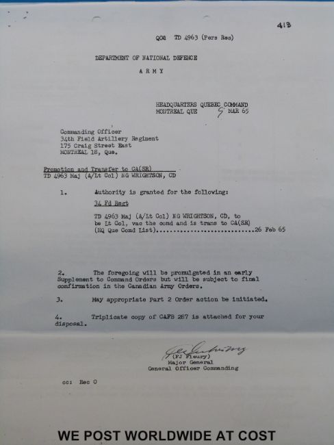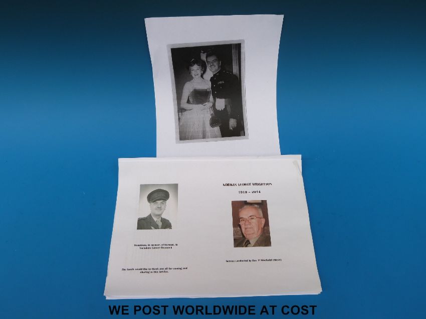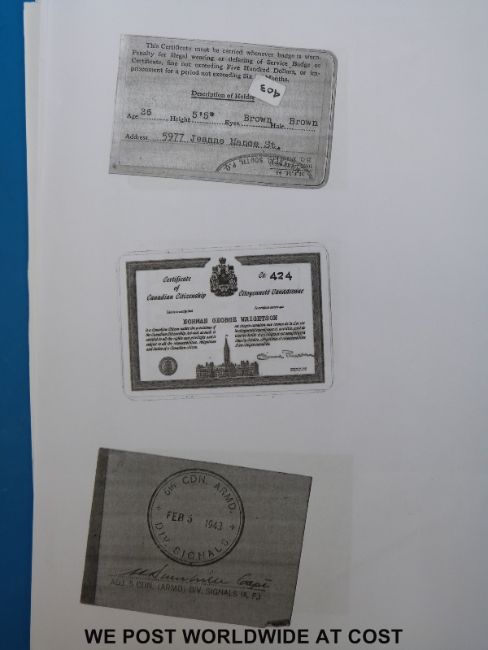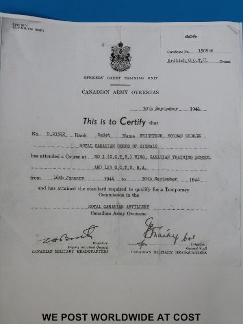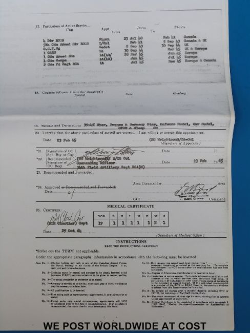 A WWII and later Canadian interest group of six medals awarded to Captain G. Wrighton, comprising 1939-1945 star, France & Germany star, 1939-1945 defence medal, 1939-1945 Canada voluntary service Volontaire medal with maple leaf clasp, 1939-1945 medal and Elizabeth II Canadian Forces Recognition, all but the last one unnamed, together with a quantity of photocopied army records, photographs etc relating to the recipient
