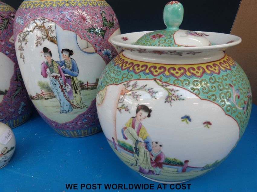 A collection of Chinese ginger jars, two cloisonné ginger jars and a vase