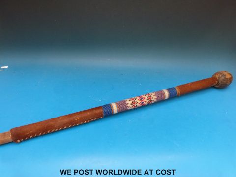A knobkerrie with bulbous top, beaded middle section and animal fur to stem