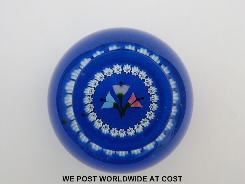 Caithness paperweight featuring three stylized flowers surrounded by a ring of white canes on a blue ground (5.5cm in diameter) together with a Stourbridge glass paperweight with four rings of canes on a light blue ground (4cm in diameter)