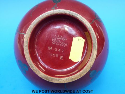 A Richard Ginori pedestal vase with floral silver lustre decoration against a red ground (13cm tall)