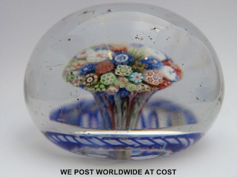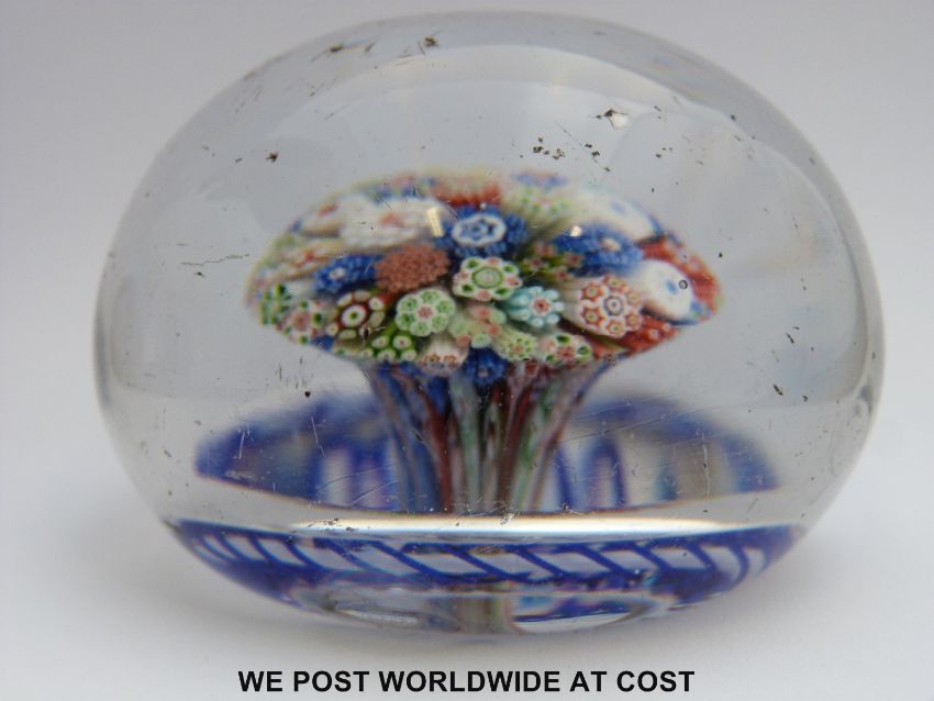 Baccarat close-pack millefiori glass mushroom paperweight, the central tuft with various multi-coloured canes surrounded by a blue and white latticino torsade on star cut base (6.7cm in diameter)