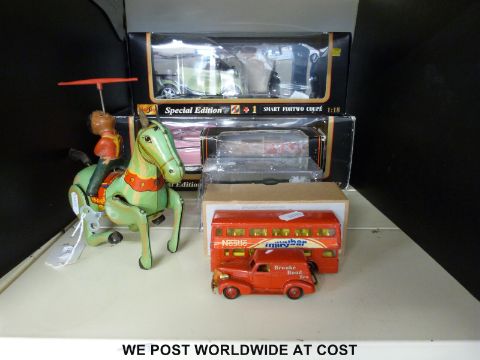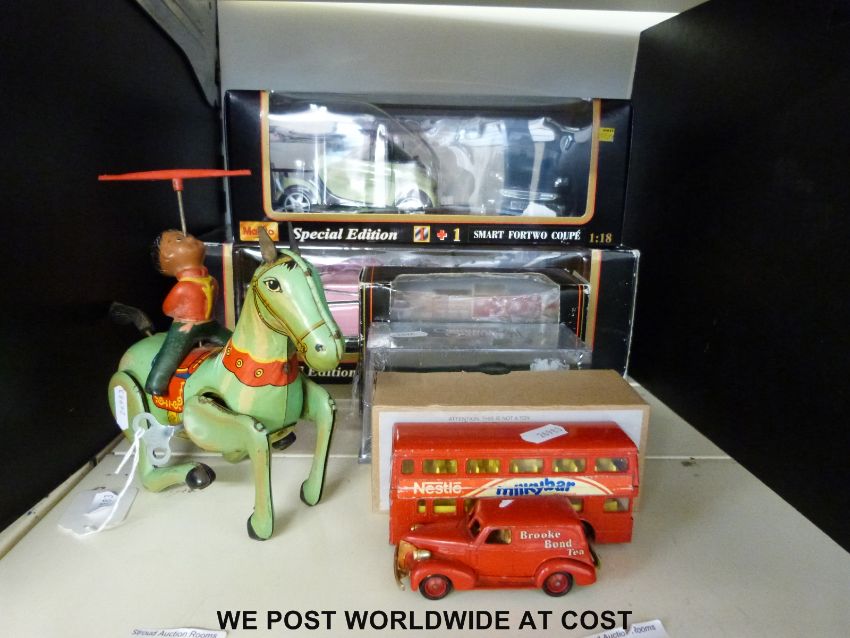 Six diecast model vehicles together with a clock work car and a clockwork horse, some in original boxes