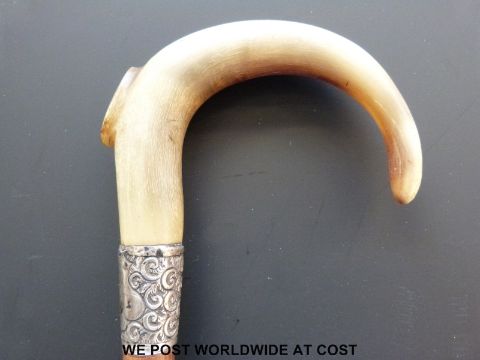 A bamboo walking stick with a horn handle and hallmarked silver collar