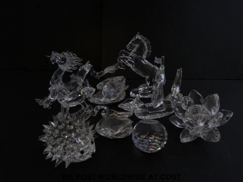 Nine Swarovski crystal ornaments including a dragon, hedgehog, ship, flower, rocking horse etc, some in original boxes