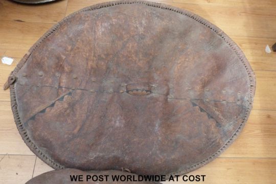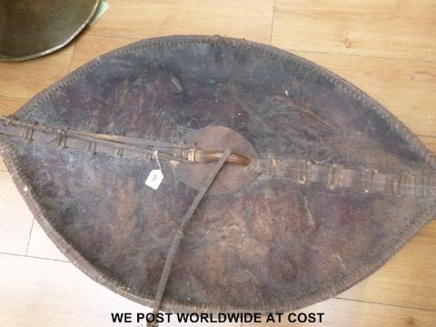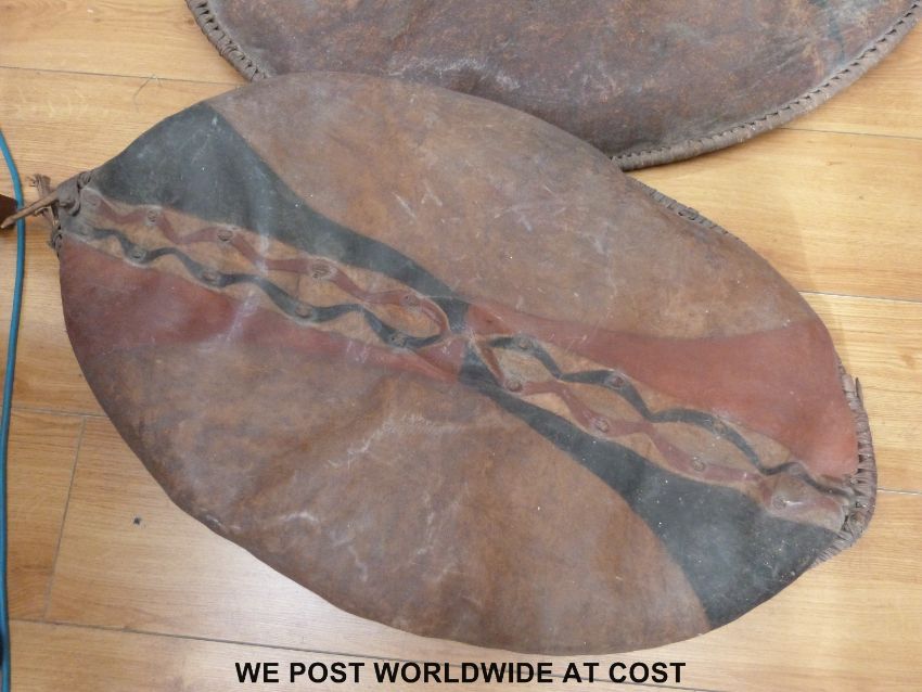 Two Masai war shields of traditional design, the hide covers with geometric designs (98cm and 108cm)
