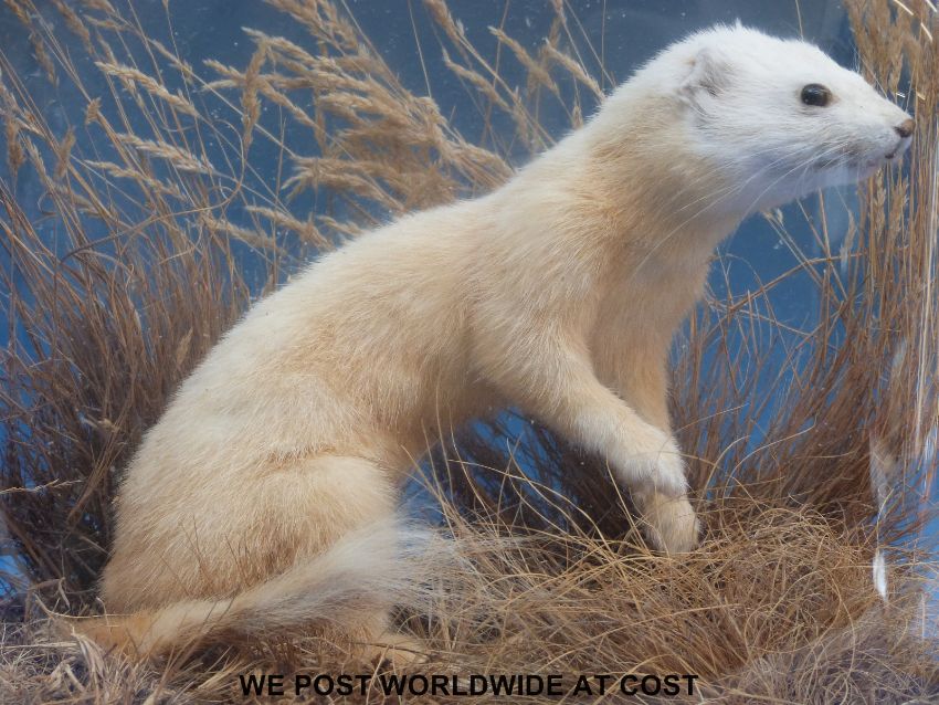 A taxidermy study of a weasel with all white coat on wooden plinth under glass dome (34cm tall)