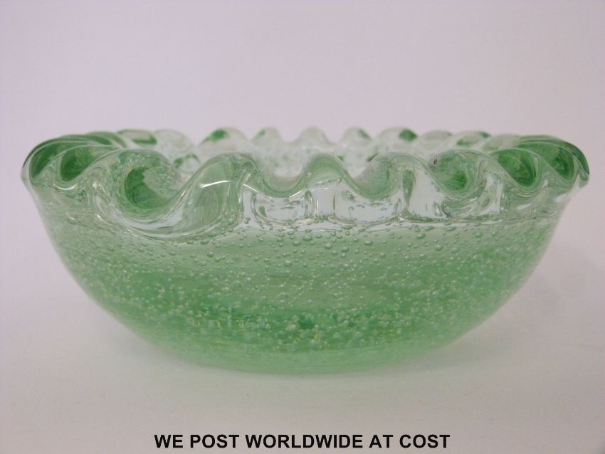 Daum Nancy green glass control bubble bowl with wavy rim, 17cm in diameter.