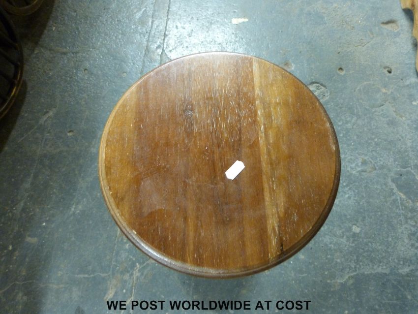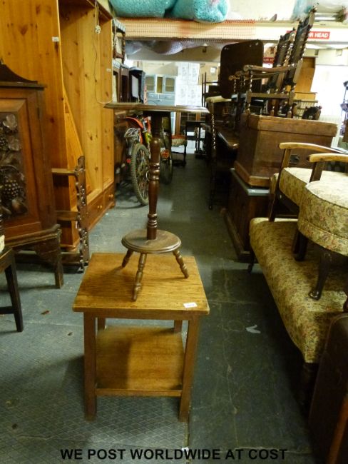 An oak coffee table, another table with tripod base, antique country armchair and a stool with turned legs and stretchers