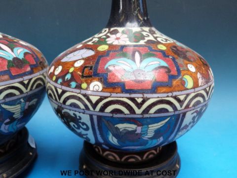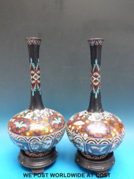 A pair of Chinese cloisonné vases on hardwood stands (35cm tall with stand)
