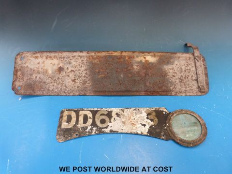 Two vehicle registration plates, one for front motorcycle mudguard incorporating a vehicle excise licence holder complete with 1941 Stroud stamped disc DD6843, and the other registration plate for car or similar DF9057 (local interest)