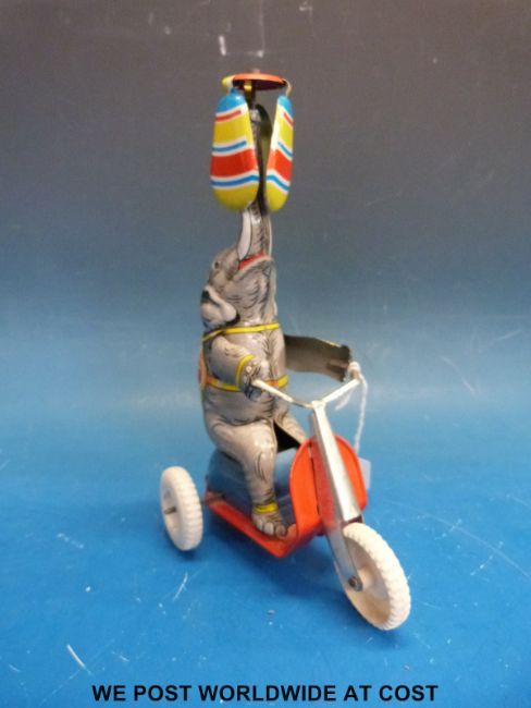 Fleischmann US Zone Germany clockwork tinplate elephant balancing a helicopter type spinning top above its head