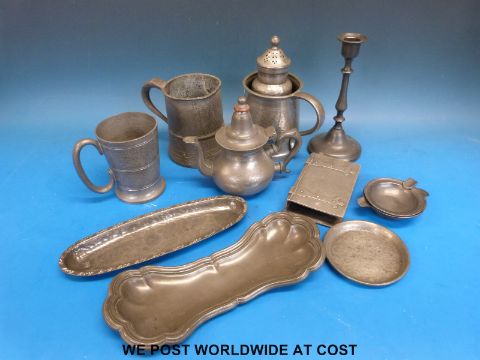 A quantity of pewter items to include Hugh Wallis dish, tankards etc including Tudric