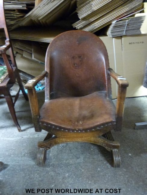 An Art Deco leather chair with embossed armorial crest