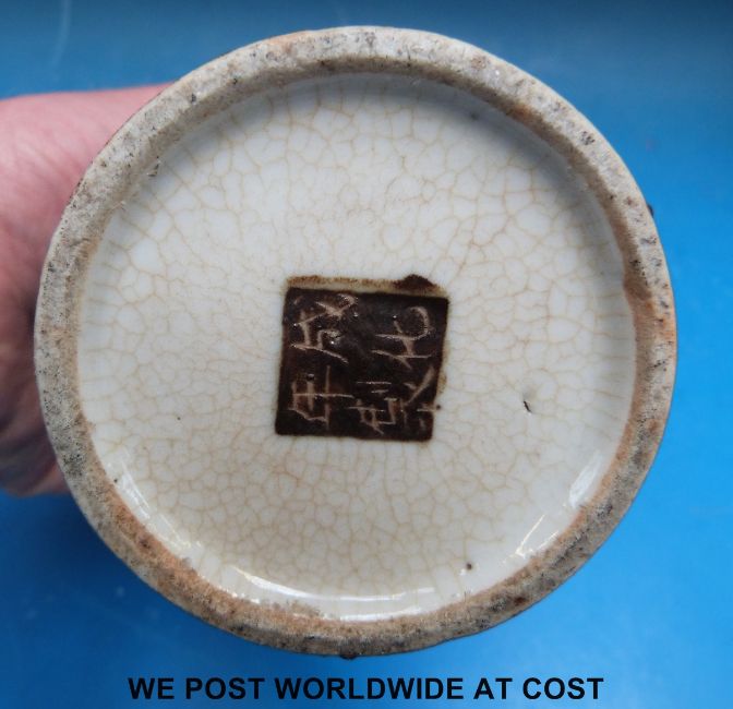 Four Chinese crackle glaze blue and white vases all depicting court figures (25cm tallest vase)