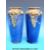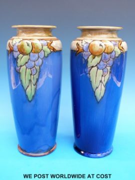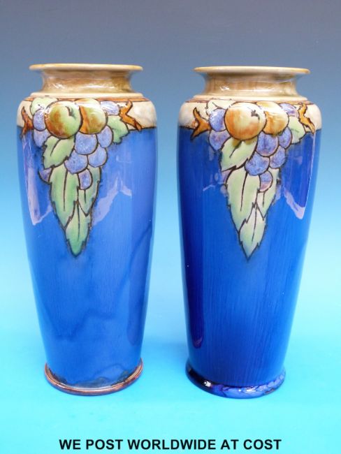 A pair of Doulton Lambeth tapered vases with apple and grape design on blue ground (26cm tall)