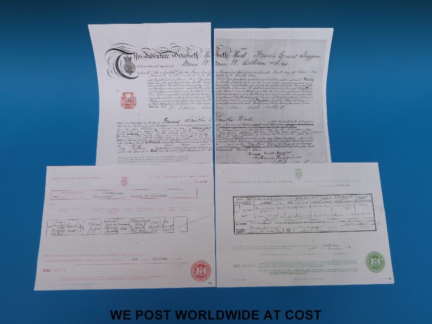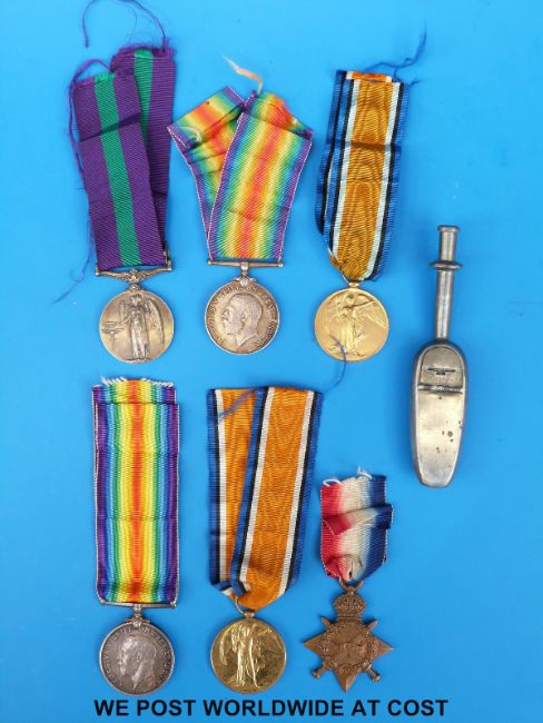 A WWI father and son medal group comprising WWI trio including 1914-1915 star awarded to M2 115706 PTE F.E. Juggins A.S.C together with a trench pipe and a WWI pair stamped W.C Juggins T.R. M.F.A and General Service medal with Iraq clasp stamped 319231 Pte W.C. Juggins Tank Corps, together with paperwork detailing Private W.C. Juggins as having died 30th August 1921 and being the son of F.E. Juggins of Cheltenham, Gloucestershire, various copied birth certificates, photographs etc