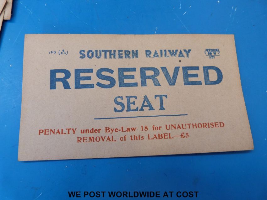 Approximately thirty Southern Railway seat reservation cards and nine Southern Region office rubber stamps mainly Woking