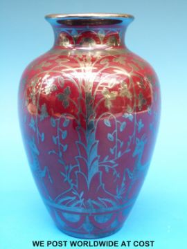 A Richard Ginori Art Deco vase decorated with silver lustre deer and foliage against a red ground (16cm tall)