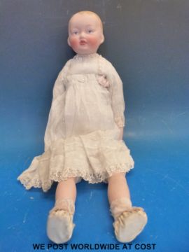 A bisque headed doll with fixed dark blue eyes & open mouth, stamped 'English made' to the rear