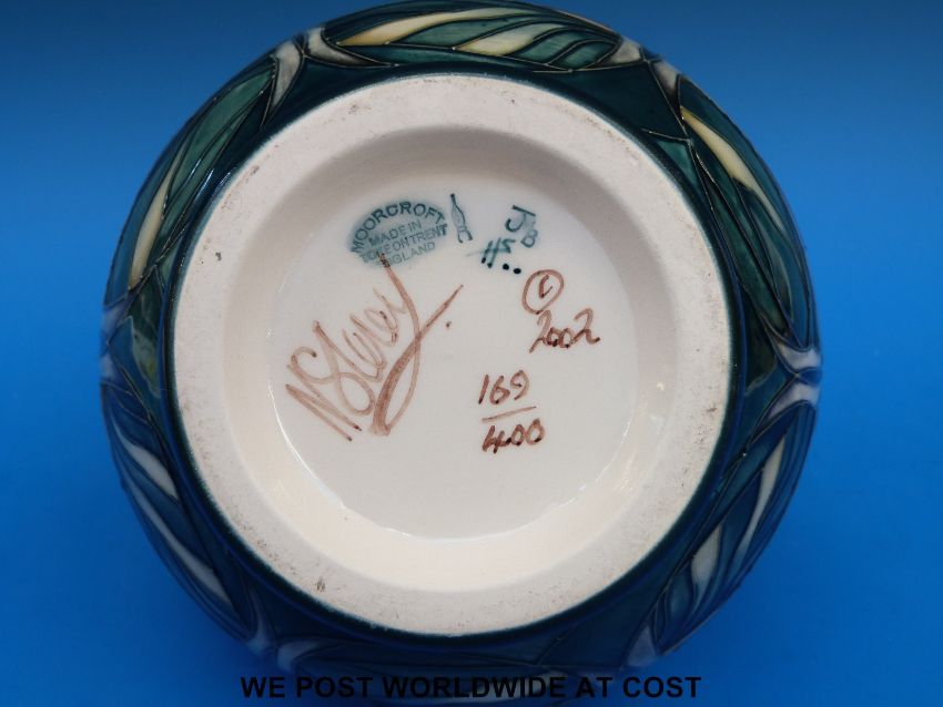 A Moorcroft pedestal limited edition vase (165/400) decorated with stylised trees and signed by Nicola Slaney, circa 2002 (19cm tall)