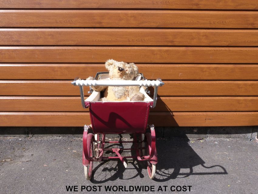 Sliver Cross dolls pram in burgundy and cream together with a vintage bear.