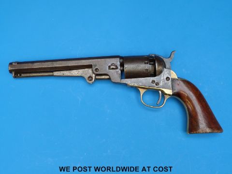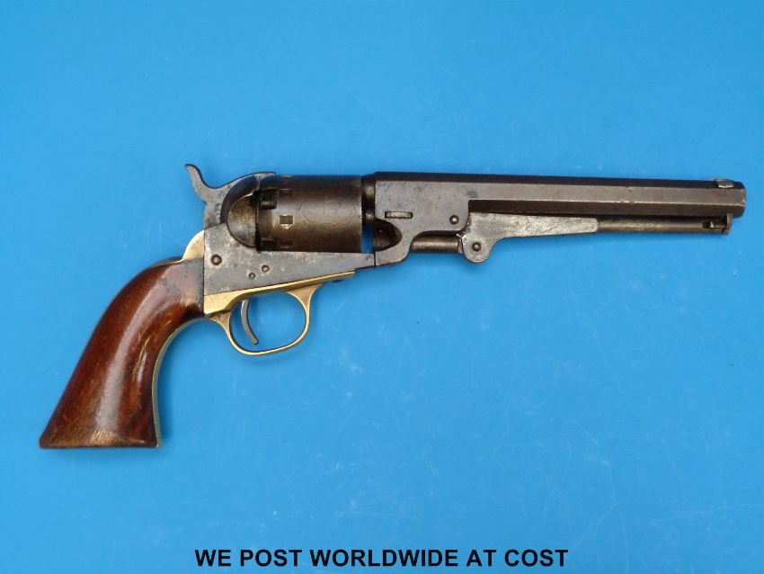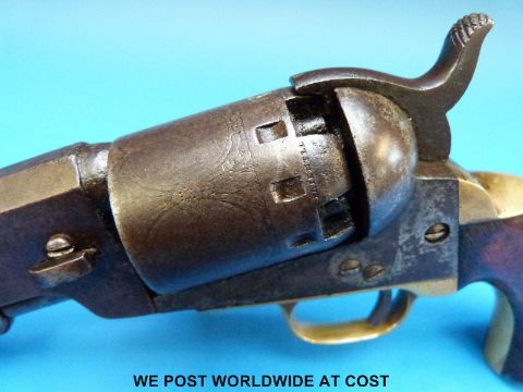 Manhattan Navy .36 fire shot hammer action percussion revolver with brass trigger guard and back strap, the cylinder engraved with floral surrounded vignettes and stamped Patented Dec 27 1859, the 6.5" octagonal barrel stamped Manhattan Firearms Co Newark NJ Patented March 8 1864, serial number 53973, overall length 32cm