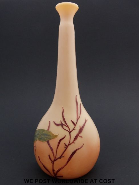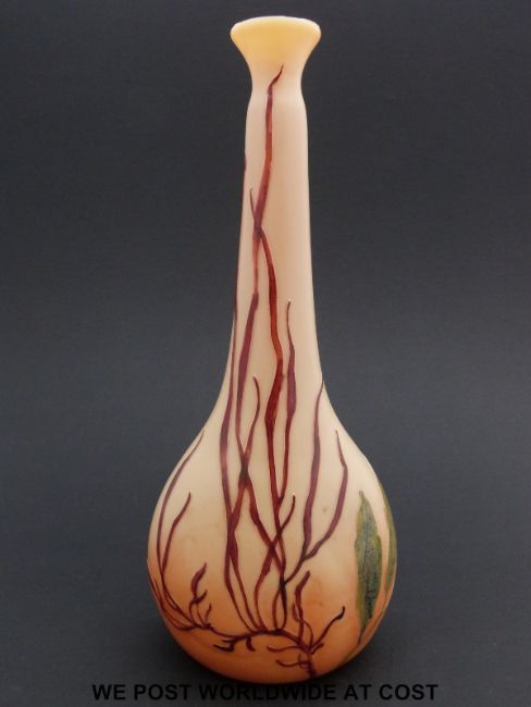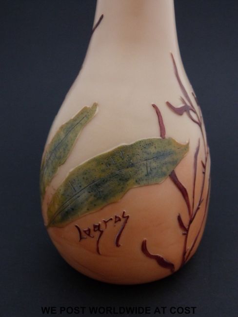 Legras & Cie cameo glass vase of compressed globe and shaft form with flared neck decorated with seaweed on peach ground, signed in Cameo to one side (27cm tall)
