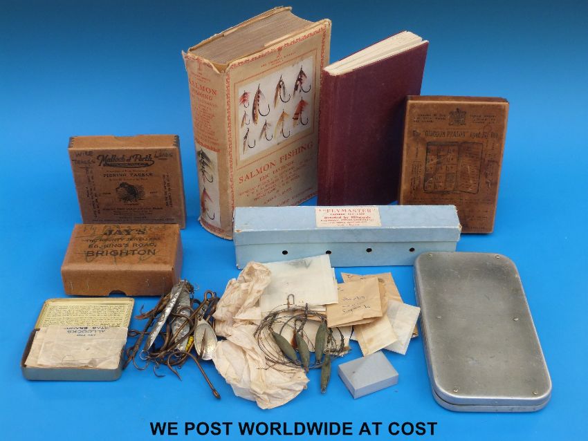 A collection of vintage fishing tackle including large bronze hooks, spinners, branded boxes by Malloch, Hardy and Millwards, metal fly box and Salmon Fishing by Eric Taverner