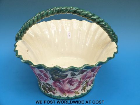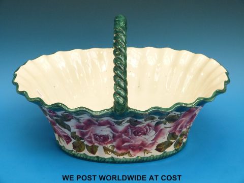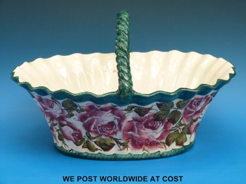 A large late 19thC / 20thC Wemyss basket decorated with roses, with impressed Weymss mark to base, Goode retailers mark and Sothebys 360 Iris Fox Collection sticker (24cm tall, length 40cm)