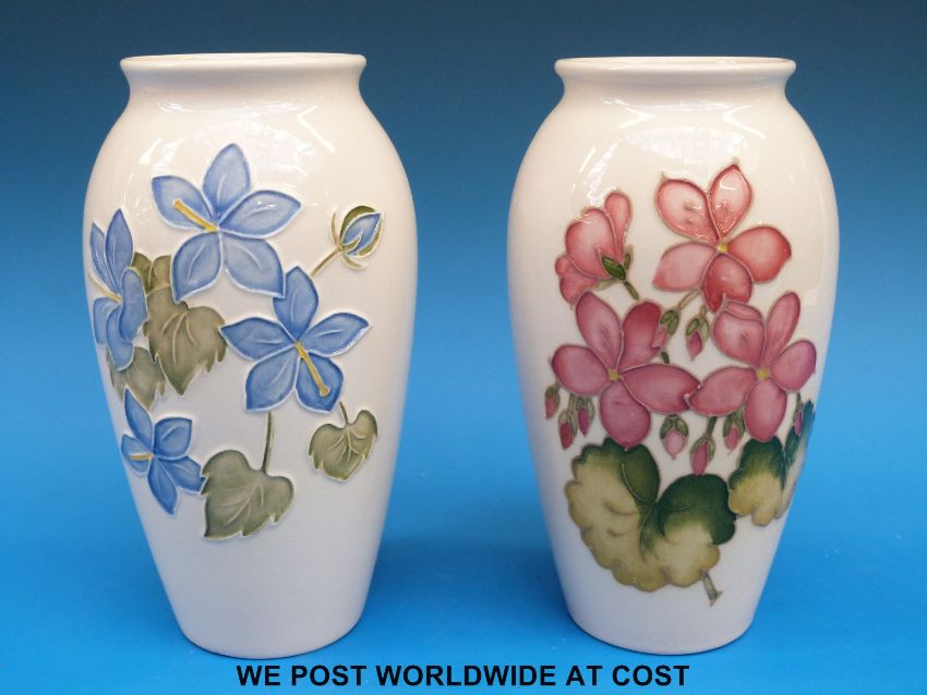 Two Moorcroft vases, one decorated with blue hepaticas the other with pink flowers (both 19cm tall)