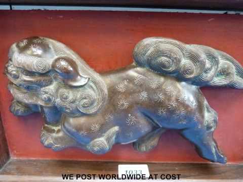 A Chinese bronze model of a Foo Dog mounted in a wooden frame