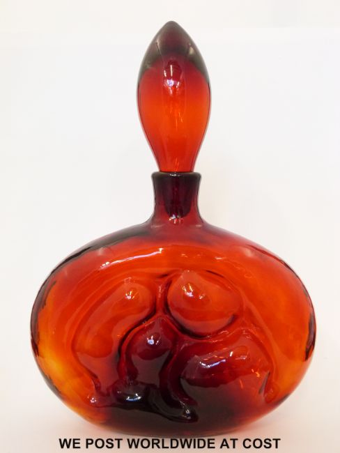 Wayne Husted for Blenko red glass decanter of flattened form with moulded design (34cm tall)