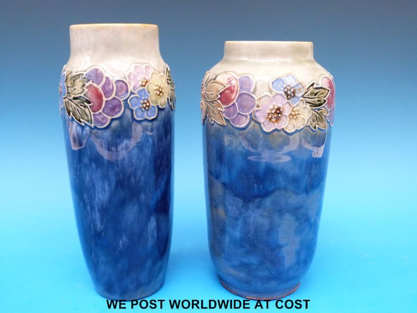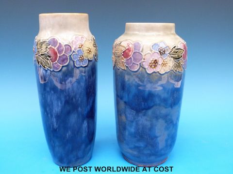Two Royal Doulton stoneware cylindrical vases (23cm tall) and matching bowl (diameter 16cm), all with tubelined floral decoration on a blue ground