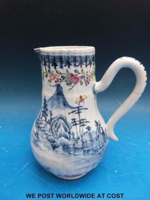 An 18thC Chinese export jug with polychrome clobbered decoration of flowers and insects to the neck (20.5cm tall)