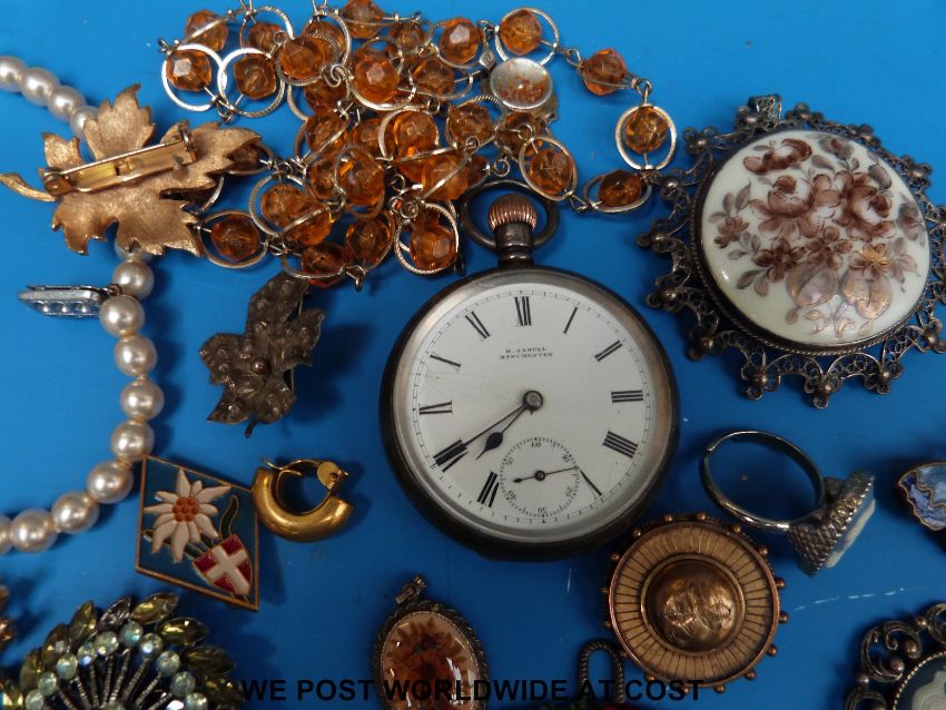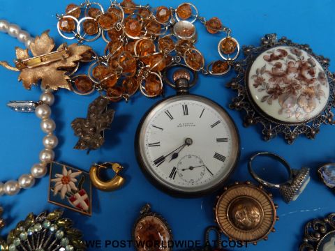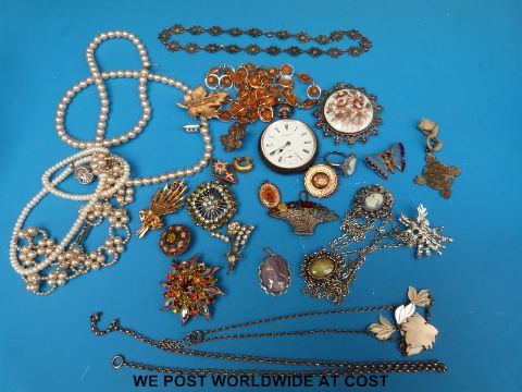 A hallmarked silver Dennison cased pocket watch, yellow metal mourning brooch, pearl necklace, filigree necklace, enamel butterfly, silver and enamel brooch etc