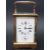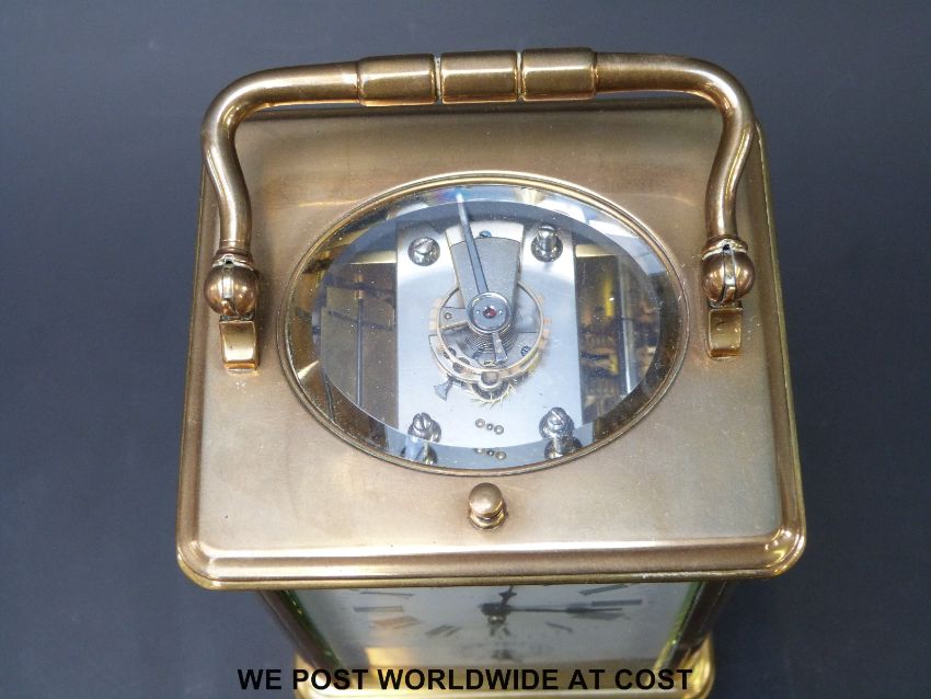 A French Gilt-brass Grande Sonnerie carriage clock with alarm, gorge case with oval top glass, white enamel dial with blue steel spade hands. Silvered platform escapement, strike/repeat/ alarm on two gongs. Strike selection lever to underside; 14.5cm tall with handle down