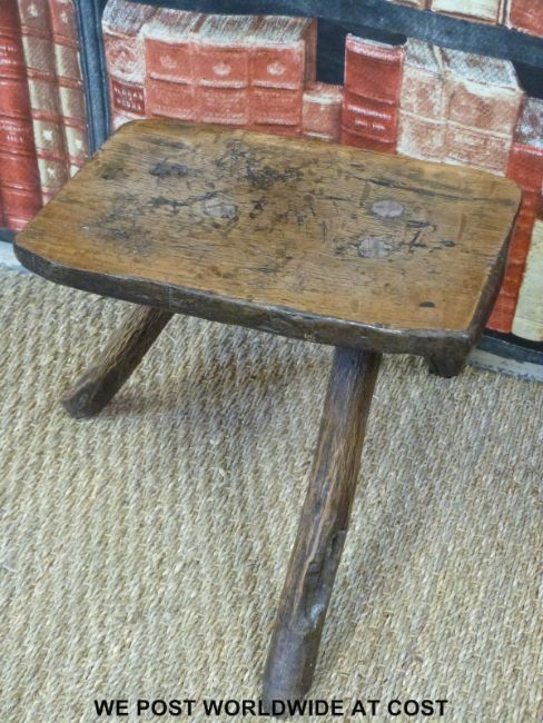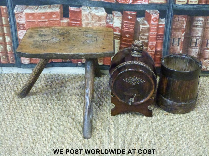 An 18th/19thC elm and yew stool, barrel on a stand and a coopered bucket