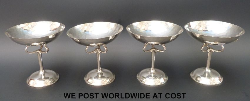 A set of four Edward VII hallmarked silver Arts and Crafts / Art Nouveau pedestal sweet meat or bon bon dishes, the hammered bowls supported on three arms and single stem base, each marked Rd505942, Birmingham 1907 maker Deakin & Francis Ltd, height 11cm diameter 11cm (630g)