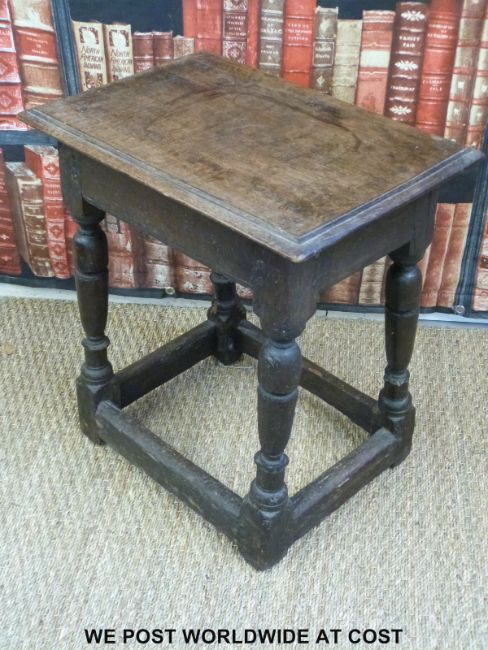An antique oak peg jointed table (W49cm) together with a similar example converted to a stick/umbrella stand