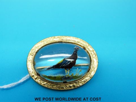 A reverse painted crystal brooch depicting a pheasant marked Mizpah