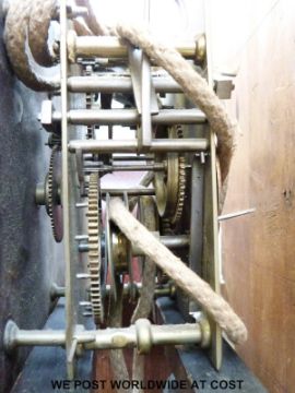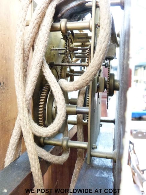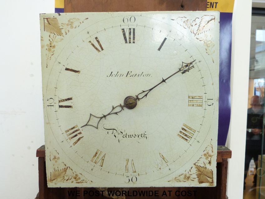 John Easton, Petworth 19thC oak cased 30 hour rope wound long cased clock, with 27cm painted dial, pierced hands, hood with attached three quarter brass ended columns (overall height approximately 194cm)
