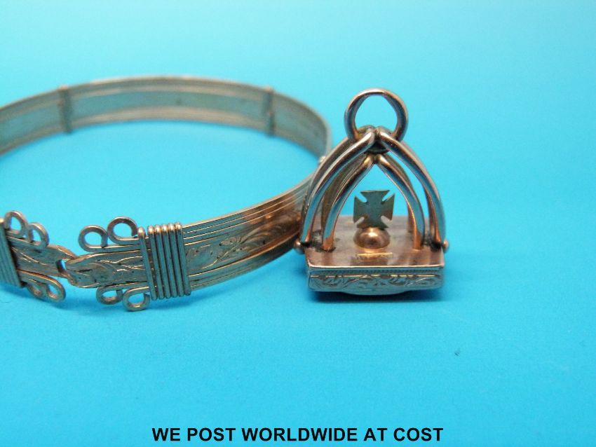 A yellow metal bangle, Victorian locket with chased decoration and a hallmarked 9ct gold fob.