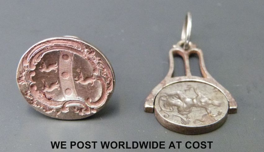 An 18thC cut steel armorial fob and a swivel fob of similar age with rearing bull to one side and dancing figure to the other, tallest 3cm