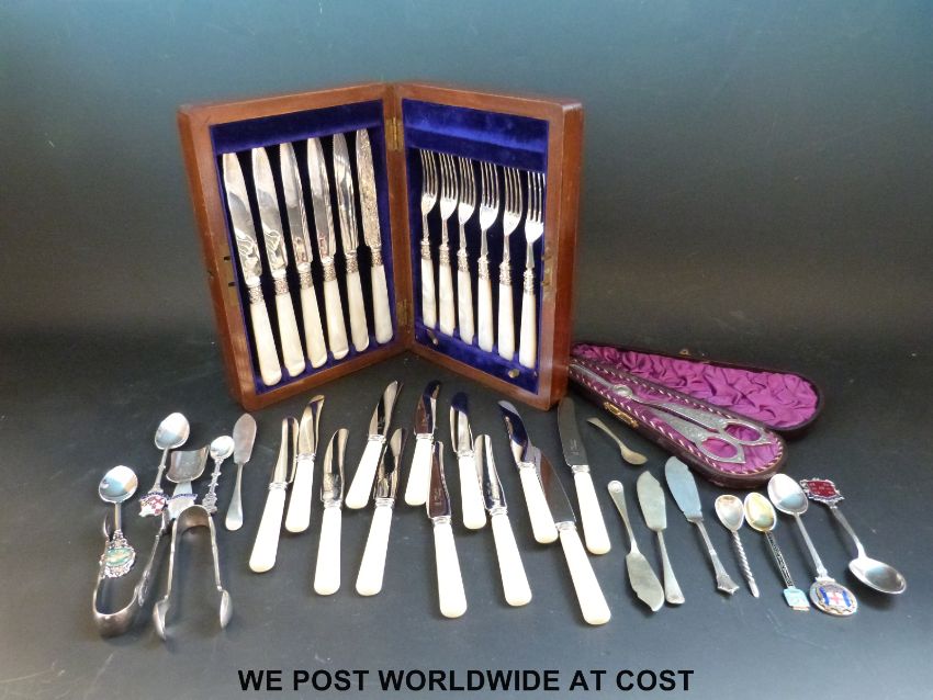 A quantity of silver plated items to include trays, salvers, cased silver ferruled mother of pearl handled dessert set, cased grape scissors etc