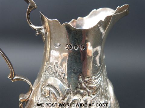 A Victorian hallmarked silver embossed jug, gravy boat and a further jug (225g)