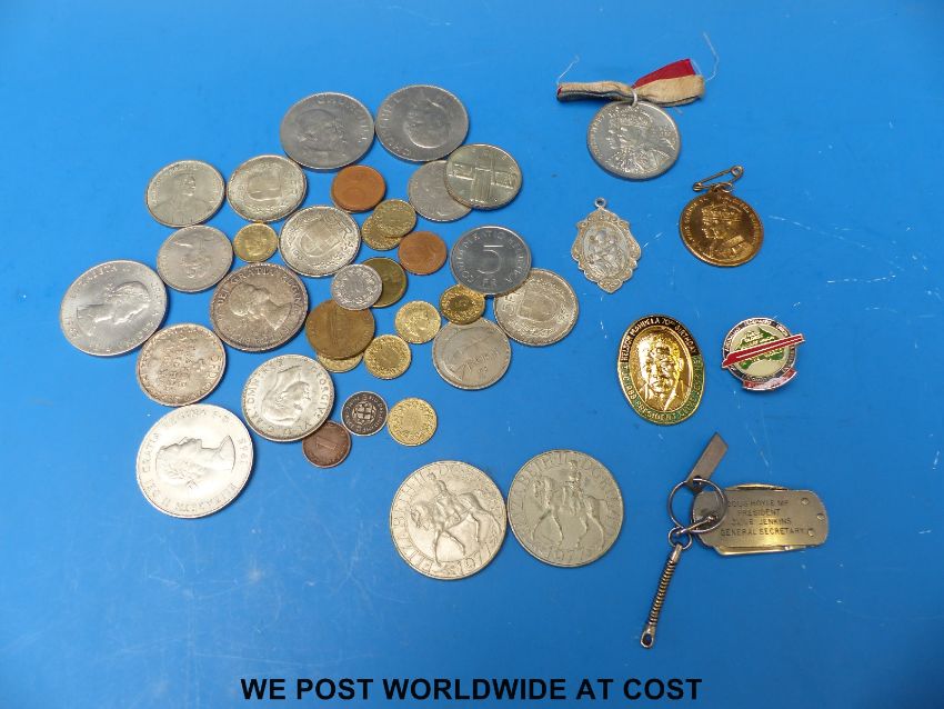 A small collection of sundry coins, medals, badges etc, very small silver content