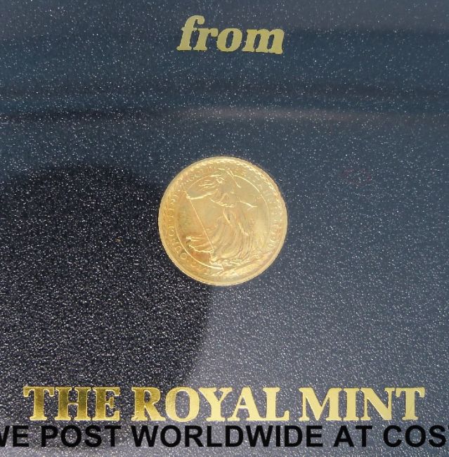 A gold Britannia Royal Mint coin 1990 (3.5g, cased 1/10 oz)